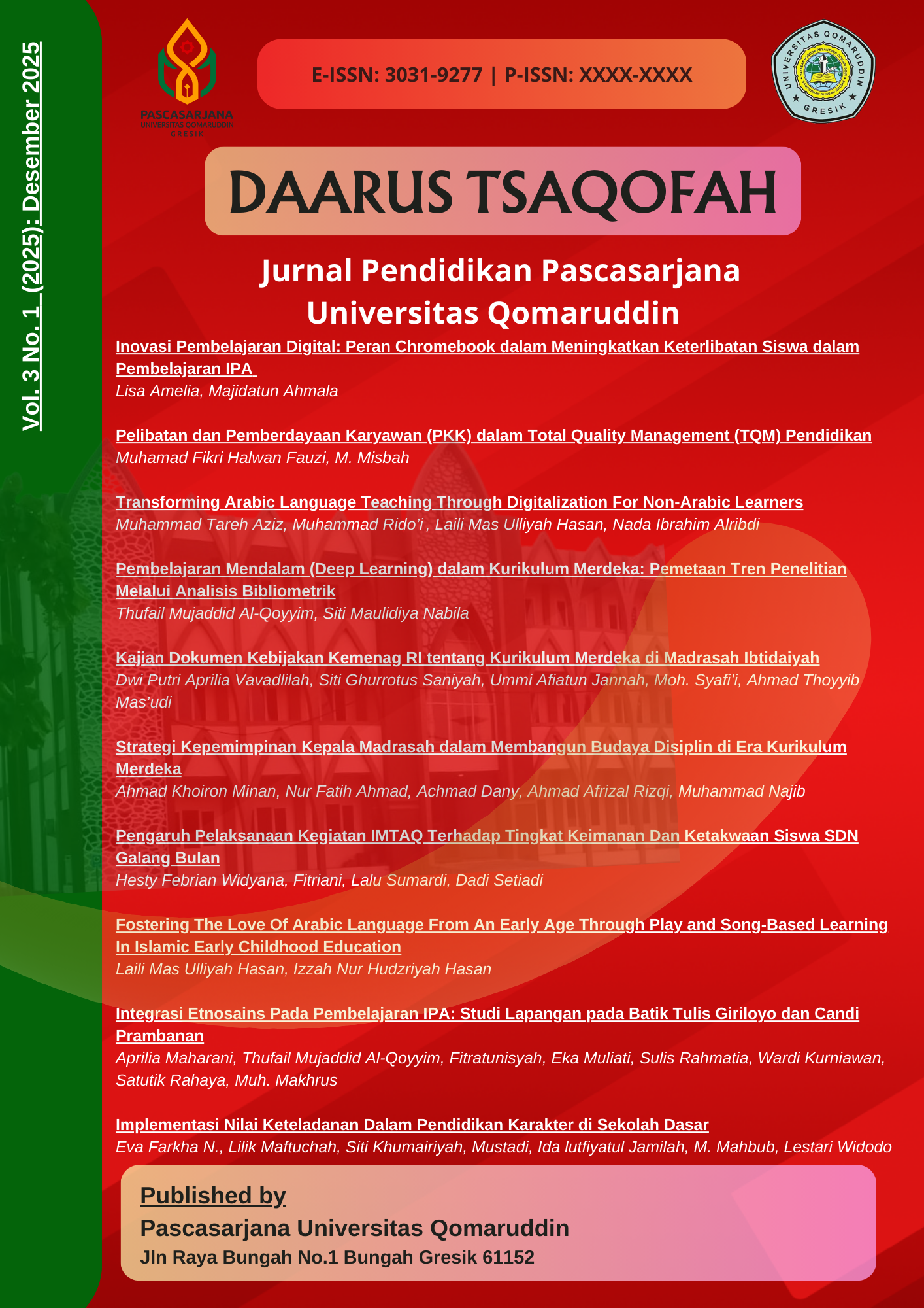 DAARUS TSAQOFAH, All articles in the December 2025 edition were written/co-authored by 41 authors from 11 Universities (Universitas Islam Darul ulum Lamongan, Universitas Mataram, Balai Publikasi Indonesia, Mataram, Universitas Sunan Giri Surabaya, Sekolah Tinggi Ilmu Bahasa Arab dan Dakwah Masjid Agung Sunan Ampel Surabaya, Princess Nourah Bint Abdulrahman University, Riyadh, Arab Saudi, Universitas Islam Negeri Sunan Ampe Surabaya, Universitas Qomaruddin Gresik, Universitas Terbuka Palembang, STAI Taruna Surabaya, UIN Prof. K.H. Saifuddin Zuhri Purwokerto) This journal is published twice a year in July and December by the Postgraduate Program of Qomaruddin University. E-ISSN Number: 3031-9277
