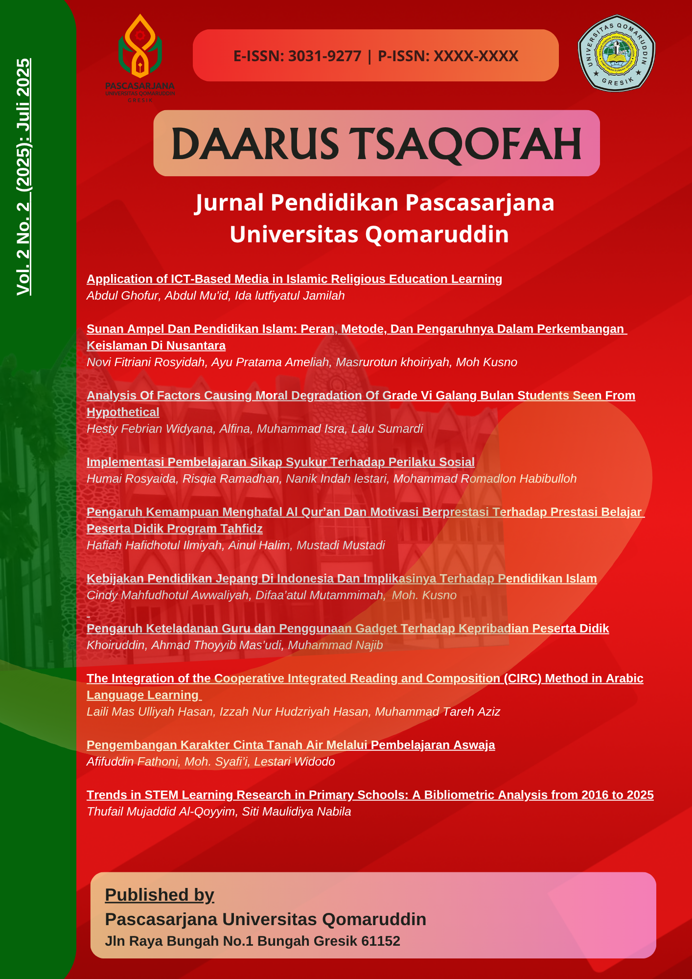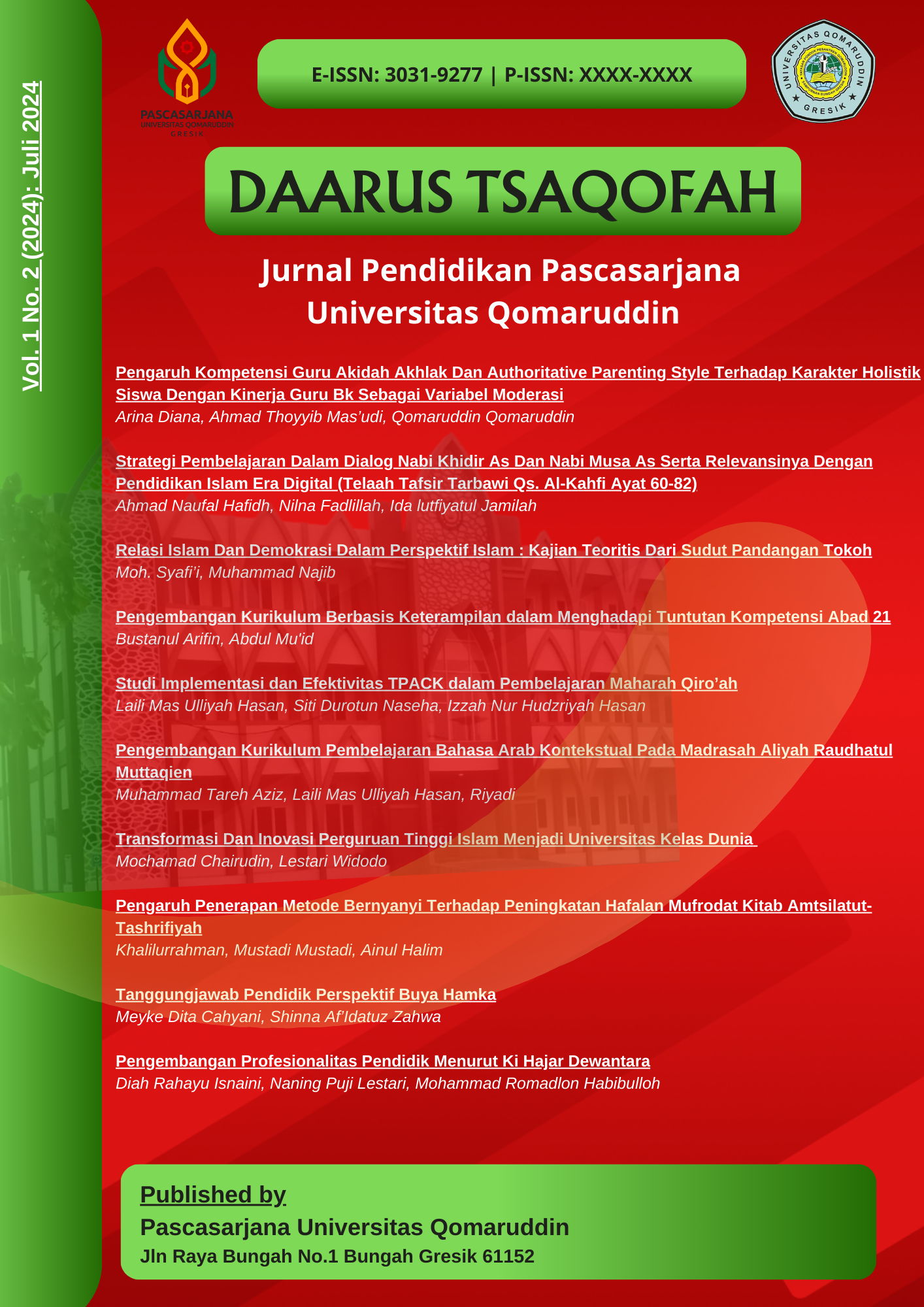 DAARUS TSAQOFAH, All articles in the December 2025 edition were written/co-authored by 41 authors from 11 Universities (Universitas Islam Darul ulum Lamongan, Universitas Mataram, Balai Publikasi Indonesia, Mataram, Universitas Sunan Giri Surabaya, Sekolah Tinggi Ilmu Bahasa Arab dan Dakwah Masjid Agung Sunan Ampel Surabaya, Princess Nourah Bint Abdulrahman University, Riyadh, Arab Saudi, Universitas Islam Negeri Sunan Ampe Surabaya, Universitas Qomaruddin Gresik, Universitas Terbuka Palembang, STAI Taruna Surabaya, UIN Prof. K.H. Saifuddin Zuhri Purwokerto) This journal is published twice a year in July and December by the Postgraduate Program of Qomaruddin University. E-ISSN Number: 3031-9277