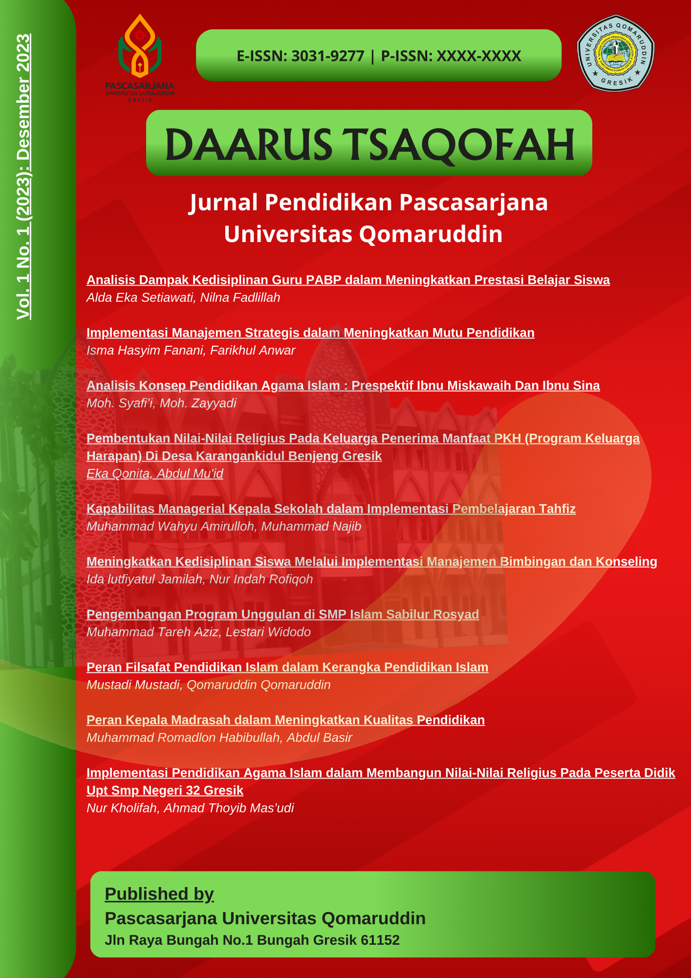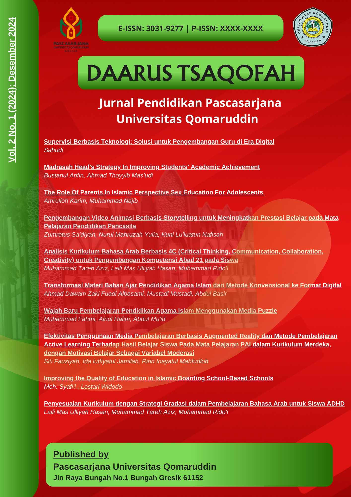 DAARUS TSAQOFAH, All articles in the December 2025 edition were written/co-authored by 41 authors from 11 Universities (Universitas Islam Darul ulum Lamongan, Universitas Mataram, Balai Publikasi Indonesia, Mataram, Universitas Sunan Giri Surabaya, Sekolah Tinggi Ilmu Bahasa Arab dan Dakwah Masjid Agung Sunan Ampel Surabaya, Princess Nourah Bint Abdulrahman University, Riyadh, Arab Saudi, Universitas Islam Negeri Sunan Ampe Surabaya, Universitas Qomaruddin Gresik, Universitas Terbuka Palembang, STAI Taruna Surabaya, UIN Prof. K.H. Saifuddin Zuhri Purwokerto) This journal is published twice a year in July and December by the Postgraduate Program of Qomaruddin University. E-ISSN Number: 3031-9277